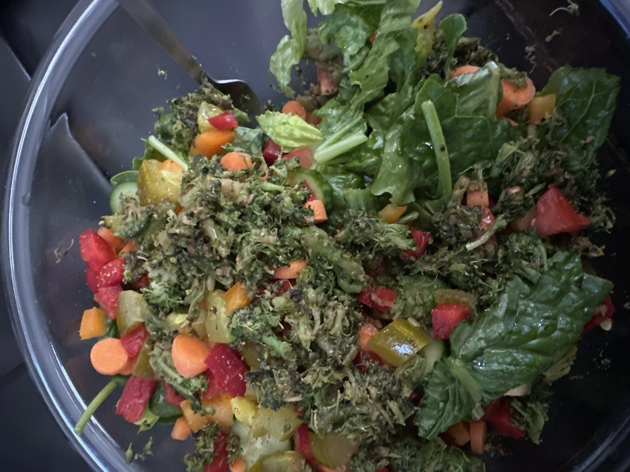 And it was delicious! I put SO MANY different veggies into it! And Iβm super proud of myself. Romaine lettuce, baby spinach, carrots, cucumber, pickles (a little salty-sour kick), red and yellow bell peppers, grapes (adds some sweetness), tomatoes, and then sautΓ©ed broccoli with onion and garlic. All topped with delicious olive oil, sea salt, and fresh ground pepper!